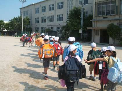 全員元気に登校。見送りに来ていただいた保護者の方,練習をはじめる陸上部の児童にむかって,元気に「行ってきます。」と出発しました。