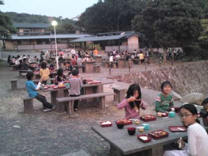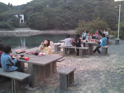 深谷水道沿いの食卓で潮の香りも味わいながらの夕食です。話し声と笑い声が響く楽しい夕食です。