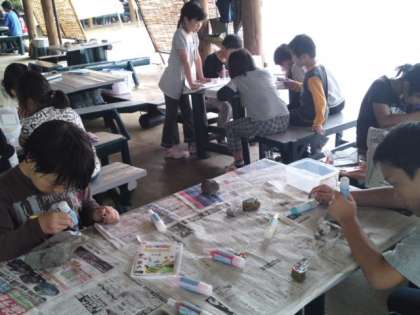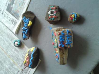 その後、着替えてゆっくり休んだ後、雨のため、プールを止めストーンペインティングをしています。