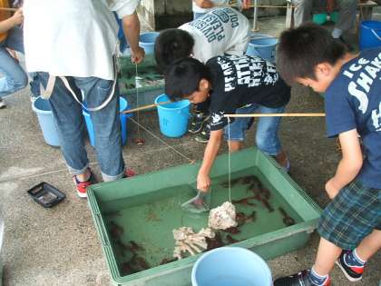 ザリガニつりもたくさんの子ども達が,集まっています。