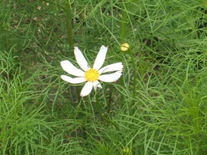 緑のカーテンの南部分のコスモス畑も気の早いコスモスが3つ花を咲かせました。