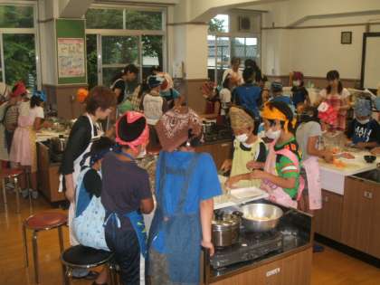 PTA学年懇親会もかねていますので,たくさんのゲストティーチャー(保護者)に教えていただきながら,ぶた汁を作りました。