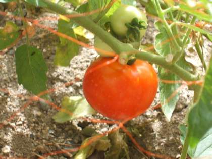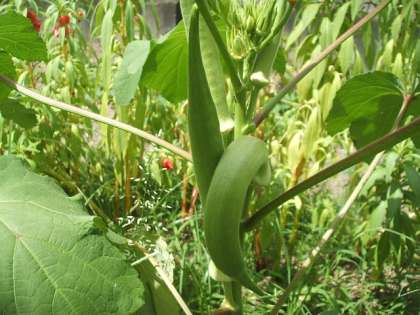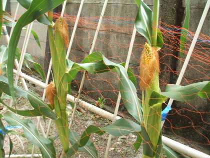 照りつける太陽を受け,トウモロコシ,トマト,オクラが育っています。