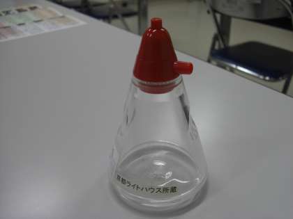写真は,醤油の入れ物です。倒れにくいデザインで,上についている突起を押さないと醤油が出ないようになっているので,倒れてもこぼれず,また,入れる量も突起を押すかげんで調節できる優れものです。ユニバーサルデザインですね。