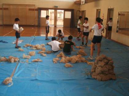 体育館にブルーシートを敷き詰めて,倉庫にしまってある粘土を運び出して三つの塊にします。