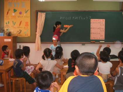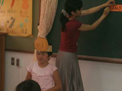 野菜のイラストをお面をつけて,友達が,3つのヒントを出します。そして,自分がつけているお面の野菜を当てるゲームです。