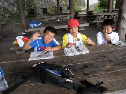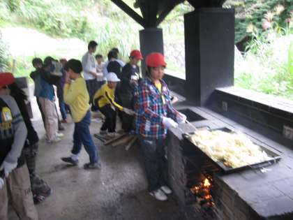 午前の活動は,魚つかみに,野外炊事(昼食のヤキソバ)でした。魚(ヤマメ)つかみは初めて経験する子も多く,キャキャと歓声を上げながら,おっかなびっくり魚つかみに挑戦していました。つかんだ魚は,早速各自捌いて塩焼きにしていただきました。炭火で焼いたヤマメをおいしくいただいた後,昼食作りに取り掛かりました。3校合同班での炊事でしたが,協力し合っておいしく出来上がりました。