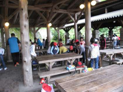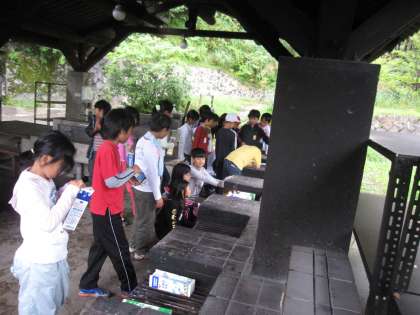 昨夜,夜通しの土砂降りの雨も上がりました。さすがに4日目,疲れが見え,朝の6時の起床時も,昨日までと打って変わって,まだ寝床に入ったままの子も多かったです。朝食のパックドッグを食べる頃には,やっと体も動き出しました。4日目朝,特に気づいたことは,先生や所員さんの話をしっかり顔を見て,全員集中して聞く姿が見られるようになったことです。亦,課題であった「後片付け」も,手際よく各自が気づいたことをてきぱきと行えました。子どもたちの姿に確かな成長の跡が見られたことを喜んでいます。