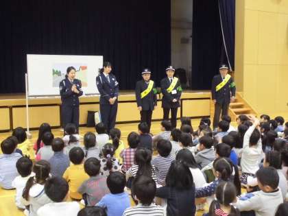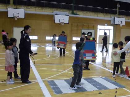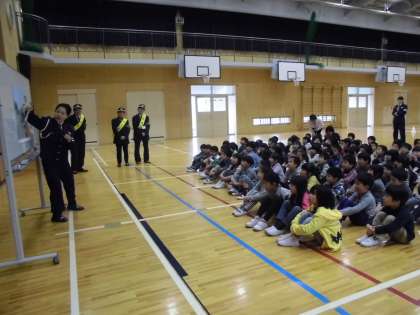 17日(火)に東山警察署の方と地域交通安全活動推進委員の方による1年生の交通安全教室がありました。安全な道路の歩き方や渡り方についてのお話を聞いた後,体育館で歩き方の練習をしました。1年生の子ども達は,教えてもらったことに気をつけながら,横断歩道で左右を確かめたり,白線の内側を車に気を付けて歩いたりすることができました。20日(金)からは子どもだけでの下校が始まります。今日教えていただいたことをしっかり守って安全に下校してほしいと思っています。