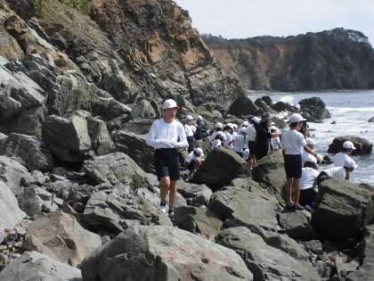 宮崎浜では,少し波が出てきたため,磯観察はクラスごとに短時間に切り上げ,ストーンペインティングのための石を拾ったり,地層の観察をしたりしました。