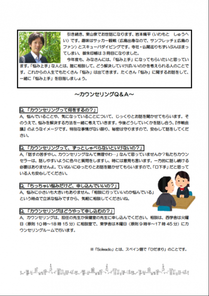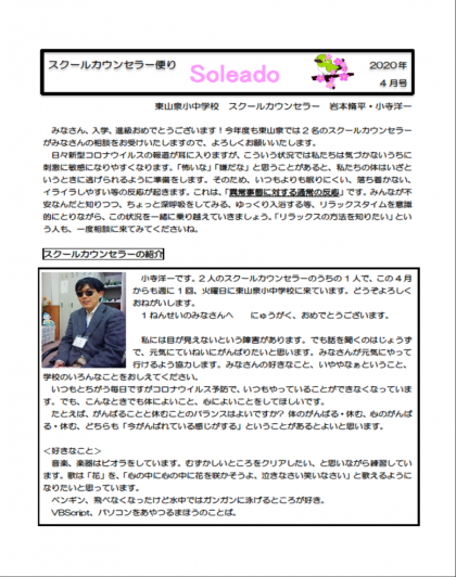 配付できていなかった4月のスクールカウンセラーだよりを載せていますのでご覧ください。