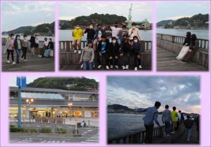 班別研修を終えて無事に広島駅に集合し,バスに乗って倉敷へ。途中,尾道駅近くの海辺で休憩しました。仲間と過ごす何気ない時間が,最高の思い出になりますね。