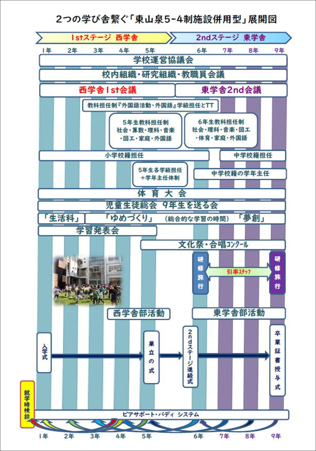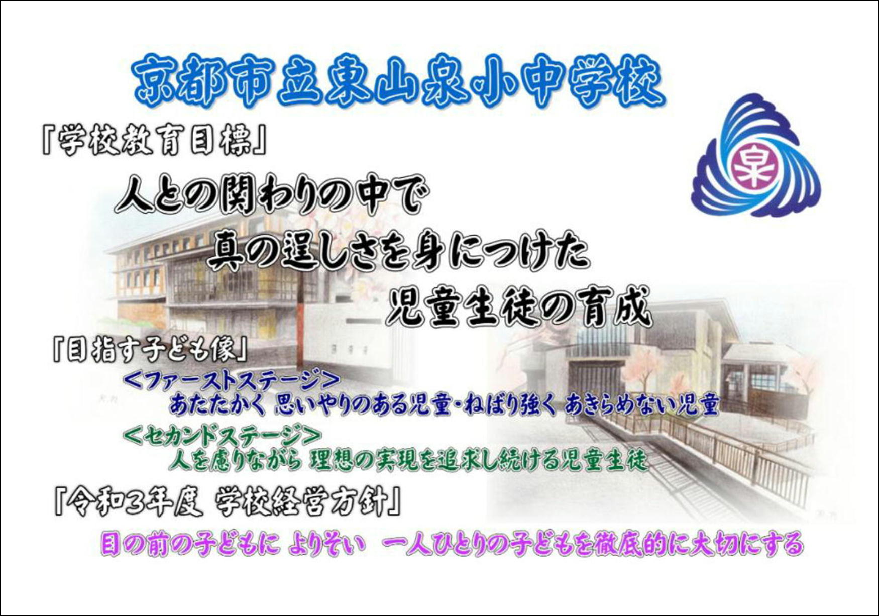 「学校教育目標」ならびに令和3年度の学校経営構想図,2つの学び舎を繋ぐ「東山泉5‐4制施設併用型」展開図を掲載いたしました。