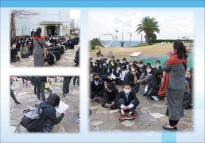 野島断層保存館の見学を終えて,集合した6年生。学年主任の先生から,この後の行程(時刻)変更の連絡がありました。その時,さっとペンを出して,しおりに書き込む素晴らしい姿が!