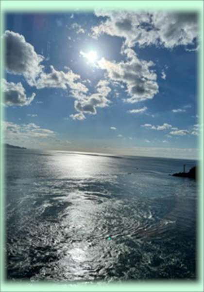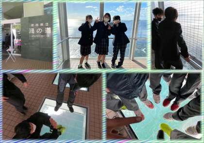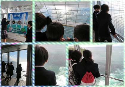 徳島県に入り,大鳴門橋遊歩道・渦の道を訪れました。“渦の道”は,大鳴門橋の橋桁内(車道の下)に造られた海上遊歩道です。海上45mのガラス床から海をのぞき込んで,渦潮や激しい潮流を体感しました。