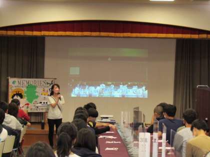 夕食のあとは,ホテル周辺で蛍や天体観測の予定でしたが,昼間降った雨で道もぬかるんでおり,室内でかつての卒業生の文化祭での舞台発表の映像を見ました。戦時中の沖縄を題材にした劇で,最後の合唱は映像とはいえ迫力ある内容でした。学年主任の先生からは,昼間の大刀洗平和記念館の体験も併せて,何かを感じ取って欲しい,という話がありました。