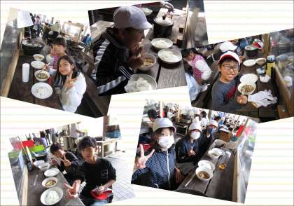班のみんなで協力し、苦労して昼食が完成しました!おこげのご飯があったり、しゃぶしゃぶのすき焼き風煮があったりしましたが、みんなで協力して作った料理は美味しかったです。花背の天気も爽やかに回復し、みんなお腹いっぱいになり満足気でした。