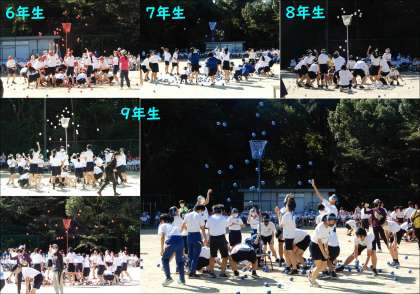 最初の競技は「色別対抗玉入れ」でした。1年生から9年生までが、ひと学年ずつ順番に玉入れを行い、かごに入った玉数の合計を競いました。身長に合わせて、少しずつかごの高さが高くなっていくのが、義務教育学校ならではです。