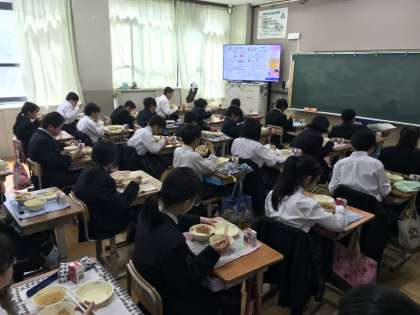 東学舎で生活している6年生も、西学舎で調理員さんの作った給食を食べています。西学舎から運ばれてきたコンテナからアツアツの給食を取り出し、テキパキと準備します。みんなニコニコ笑顔で給食をほおばっていました。
