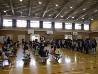 5月10日(水)の2時間目に、西学舎体育館で1年生〜5年生の児童による、「1年生を迎える会」を実施しました。2年生〜5年生からは、学校での正しい過ごし方、西学舎の教室の紹介、学校生活を支えてくださっている教職員の紹介等、どの学年も1年生に分かりやすく伝えてくれました。5年生は、美しい歌声で東山泉の校歌を披露してくれました。学年全体での活動、そして異学年との対面での交流も久々でしたが、緊張感の中で発表する子ども達の姿は、どの学年もとっても素敵でした。1年生からは、「あおいそらに絵をかこう」の歌で、感謝の気持ちを伝えてくれました。迎える会が終わった後は、5年生が体育館の片付けをしてくれました。司会進行や後片付け等5年生の「さすが西学舎のリーダー!!」という姿も見ることができました。