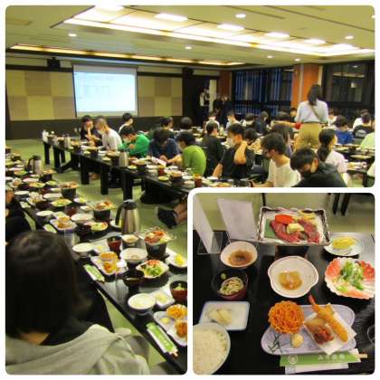 牛肉の陶板焼き、エビフライ、春巻き、唐揚げ、冬瓜のあんかけ、うどん、ところてん、サラダ、フルーツ、ご飯、味噌汁です。