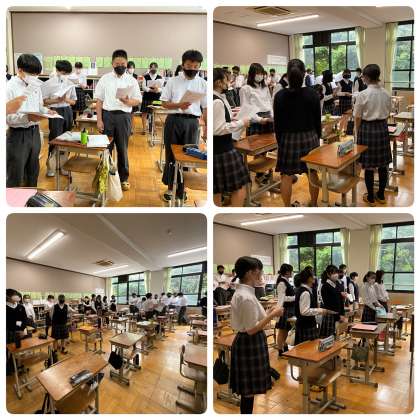 明日行われる合唱コンクールに向けて、クラスごとにパートリーダーが中心となって、8回の合唱タイムの中で練習を進めてきました。明日はどのクラスも、精一杯の歌声を届けましょう。