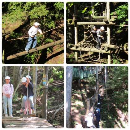 冒険の森のアスレチックがスタートしました。冒険の森には、縄ばしごや丸太ロープ、滑車すべり、野猿など、様々な遊具があります。みんなキャーキャー言いながら、冒険の森を楽しんでいます。