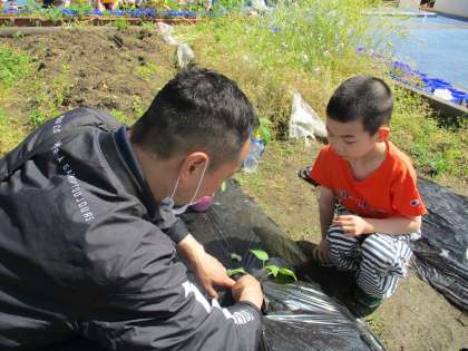 野菜の苗植えをしました。1人1回ピーマン・なす・トマトを植えました。苗が折れなように気をつけながら、植えました。子どもたちは少し緊張した様子でしたが、上手に植えることができてとてもうれしそうな様子でした。お水やりまで丁寧にできました。これから、毎日観察とお水やりを頑張って野菜の生長を楽しんでいきます。