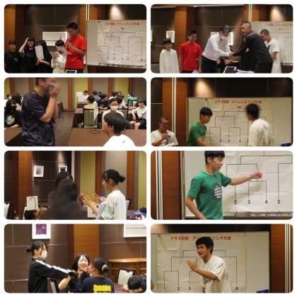 次はモノマネバトル。エントリーした2人が先生のモノマネで勝負しています。勝者は拍手の大きさで決まりました!