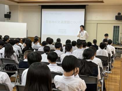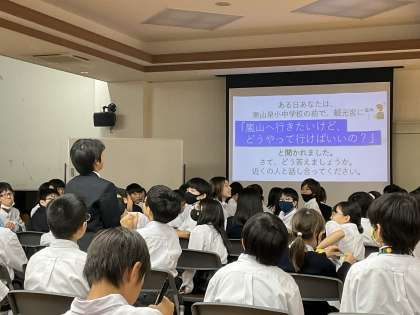 今回の夢創の学習は、歩くまち推進室の方々にゲストティーチャーとして来ていただき、京都市の現状や課題などを教えていただきました。京都には年間5万人もの観光客が世界中から訪れるそうです。なぜ京都を選んでくれるのか、京都のどんな観光地を訪れているのか、などたくさんの質問をして学びを深めていました。