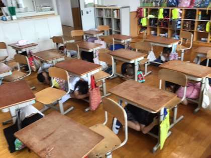 頭を守るためにしっかり机の下にかくれ、机の脚を持って地震に備えました。