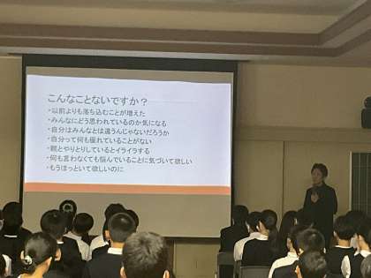 21日(木)7年生6限目に、「泉いきいき健康教室」が実施されました。本校スクールカウンセラーの岩本先生から、思春期の心の変化を、身近な生活体験を例に挙げながらわかりやすくお話していただきました。時には、自分の思うようにならない心の変化も、より大きく成長するためには必要なことであり、それらとどのように向き合うことが大切かを考えることができました。