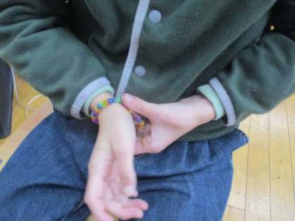 自立活動では「ビーズとおし」をしました。小さなビーズをひもにひとつひとつとおしていきました。真剣に集中して取り組み、かわいブレスレットが完成しました。完成して、とてもうれしそうな様子でした。