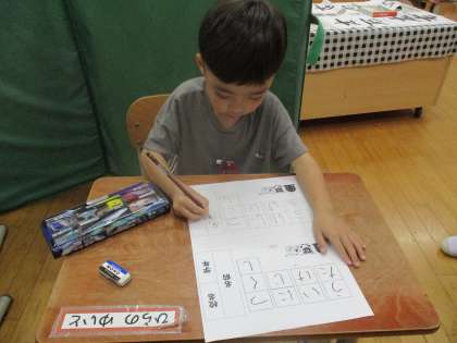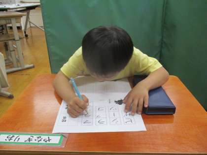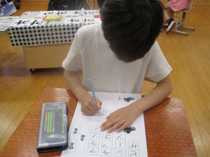 今年度初めて硬筆にチャレンジしました。子どもたちは「とめ・はね・はらい」を確認してお手本を見ながら、実際に書きました。今までにないくらいに集中して取り組むことができ、美しい作品に仕上げることができました。