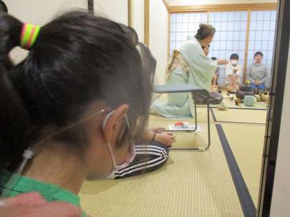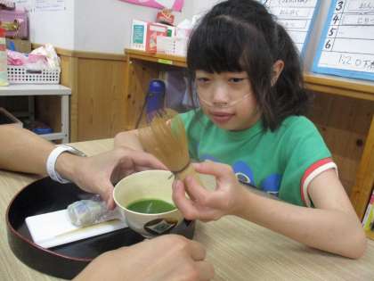 5年生は茶道体験がありました。和室で先生のお話を聞いて、実際にお茶をたてました。楽しく細かく丁寧にできました。きれいな和菓子をおいしくいただきました。