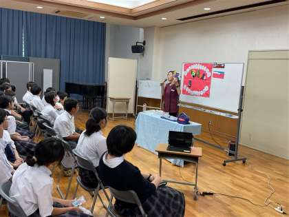 今回の指導では、むし歯ができる仕組みや、歯垢(しこう)・歯肉の状態について、模型や図を使いながら分かりやすく教えていただきました。子どもたちは、自分の歯の健康について考える良い機会となり、真剣な表情で話を聞いていました。