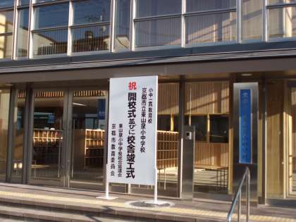 本日午前10時より,西学舎(元一橋小学校)におきまして「東山泉小中学校開校式並びに校舎竣工式」を,またそのあと東学舎(元月輪中学校)で「校舎見学会」を実施いたします。
