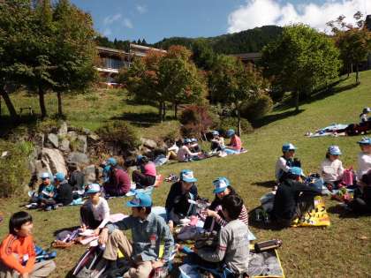 水車小屋周りの芝の上で昼食です。早めの昼食ですが,「もう,おなかすいた」と,食欲旺盛元気いっぱいです。もちろん,ごみは分別します。わり箸を使わず,自分のお箸を使う子どもがたくさんいました。次は,いよいよ一つ目の活動,クライミングと自然観察へ出かけます。