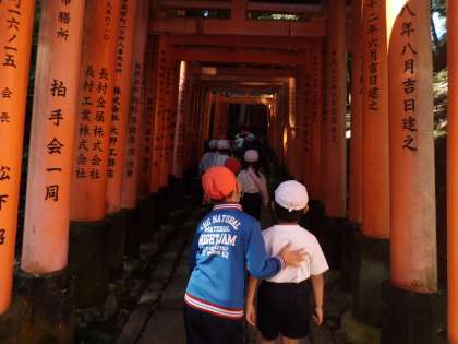 11日(水)に1〜3年生は稲荷山登山に出かけました。「だいじょうぶ?」「もう少しだよ。」と,互いに声を掛け合いながら,みんなで元気に稲荷山を一周することができました。東学舎の運動場に戻ってきた後はお弁当タイム。3年生の子ども達はリーダーの役目を終えてホッとした表情でうれしそうにお弁当を食べていました。