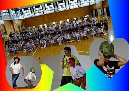 頼もしい姿を見せてくれるのかと思いきや,コント仕立ての準備運動が始まり,一気に楽しい雰囲気をつくってくれました。保護者の方も交えての鬼ごっこやゲームなどで,交流を深めた後,ドッジボールを楽しみました。児童だけではなく,保護者の方のナイスプレーもたくさん出て,大いに盛り上がりました。