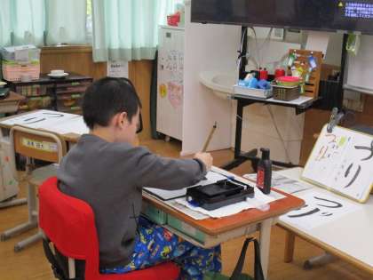子どもたちは日に日に書写の授業を通して、文字に対する興味・関心の幅を広げています。1.2年生は、文字を美しくきれいにかけるように子どもたち同士で声を掛け合いながら頑張る姿が見られました。3年生以上は、文字の大きさや形を意識しながら集中して取り組んでいました。