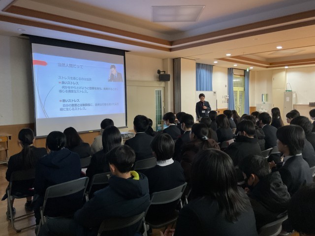 9年生は、本校スクールカウンセラーの岩本先生に、ストレスマネジメントの講演をしていただきました。