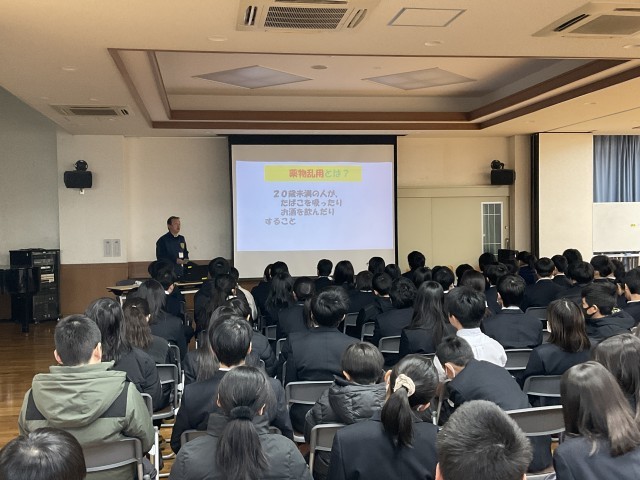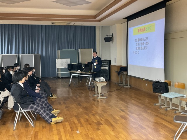 東山警察署スクールサポーターの方に来ていただきました。薬物についての知識、その怖さ、いざという時の断り方。たくさんのことを丁寧に教えてもらいました。パンフレットもいただいたので、この日の話を、ぜひご家庭でも話題にしてください。