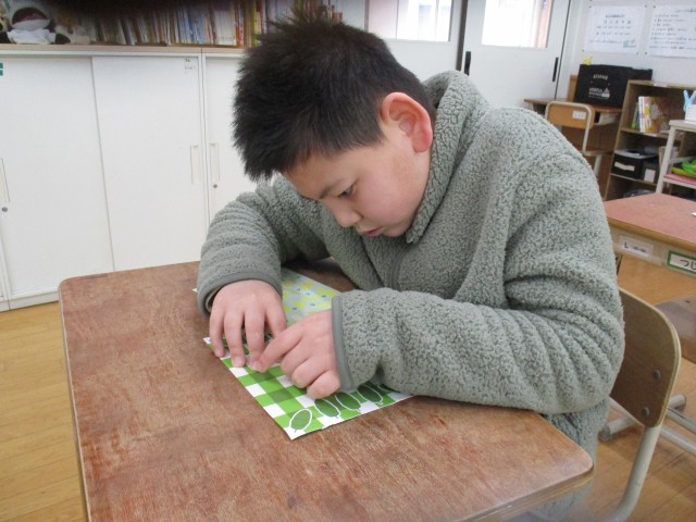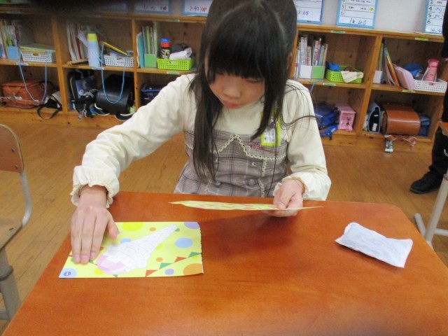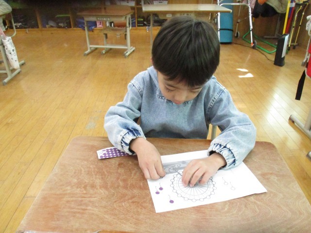 自立活動では、「てさきのうんどう」をしました。台紙に小さなまるシールを順番に貼っていきました。子どもたちは、細かい作業になりますが、ひとつひとつ丁寧に集中して取り組む姿が見られました。そして、完成するととてもうれしそうな様子でした。少しずつレベルアップしてチャレンジし続けていきます。