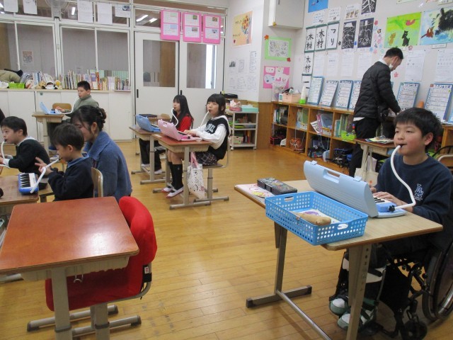 音楽科では、特別ゲストで総合育成支援員の先生と学習をしました。「いのちのうた」を歌っていただき、子どもたちはきれいな歌声にとても感動していました。また、初めてみんなでけんハモにチャレンジしました。息遣いや指使いに苦戦する様子も見られましたが、前向きに取り組む姿が見られました。これから、1組で練習を積み重ねていけたらと思います。