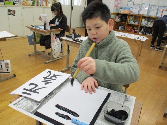 今週は書写で新しい文字に挑戦しました。文字の大きさや形に加えて太さも意識しながら、丁寧に取り組むことができました。子どもたちは、名前もバランスを意識しながら、最後まで諦めずにやりきることができました。どんどん集中力が高まっています。