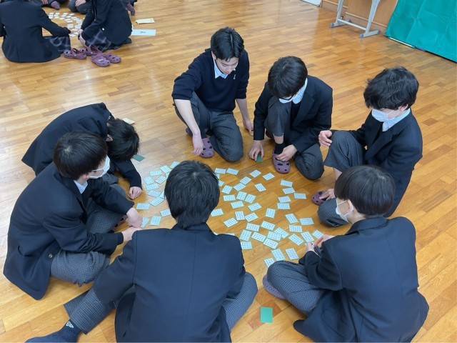 7年生の百人一首大会を行いました。今回の大会はグループごとのクラス対抗戦として実施し、読み手も生徒、区切りごとの太鼓役も生徒が担当しました。どのグループも集中しながらも和気あいあいとした雰囲気で取り組み、会場には札を取る音と、楽しそうな笑い声が終始響いていました。今回の優勝は3組でした。百人一首は、日本の美しい文化である「和歌」に親しむ貴重な機会です。これからも日本文化の魅力にふれる活動を大切にしていきたいですね。