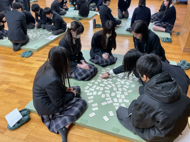 本日5・6時間目にかるた大会として百人一首をしました。それぞれのグループで1位を目指して白熱した戦いでした!9年生全員で残りの日々を大切に過ごしていきます。