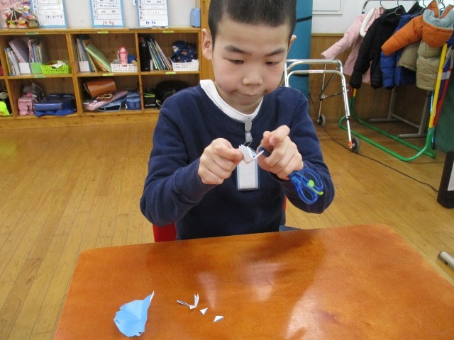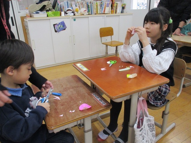 開睛小中学校のお友達にプレゼントを作りました。折り紙を自由に切ってオリジナルな花を作りました。子どもたちは、できたお花を開いてとてもうれしそうな様子でした。カラフルなすてきな花束ができました。