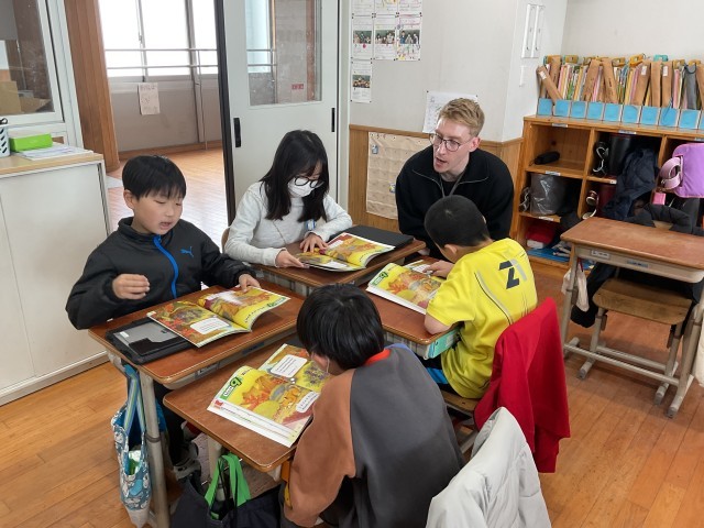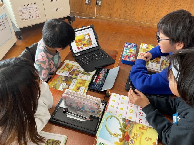 3年生最後の外国語活動は、「Who are you?」というお話を、グループごとに音読発表する活動でした。スペンサー先生に正しい発音を教えてもらいながら、各グループすらすらと音読できるようになりました。ジェスチャーや動物の鳴き声などの工夫も取り入れ、とても楽しい発表会になりました。